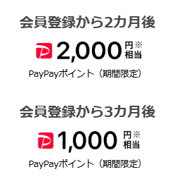 【3,000円ポイント】会員登録2か月後2,000円+3か月後1,000円